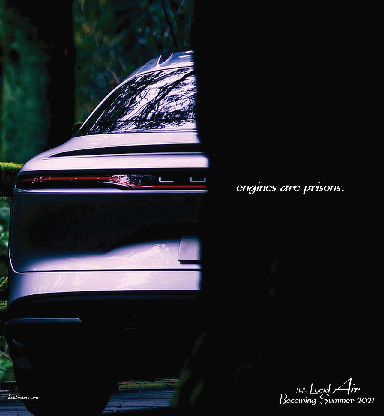 For Lucid Air—their first model—I went “teaser”: wanted to talk to a High-minded. Different angles. Excite the senses.