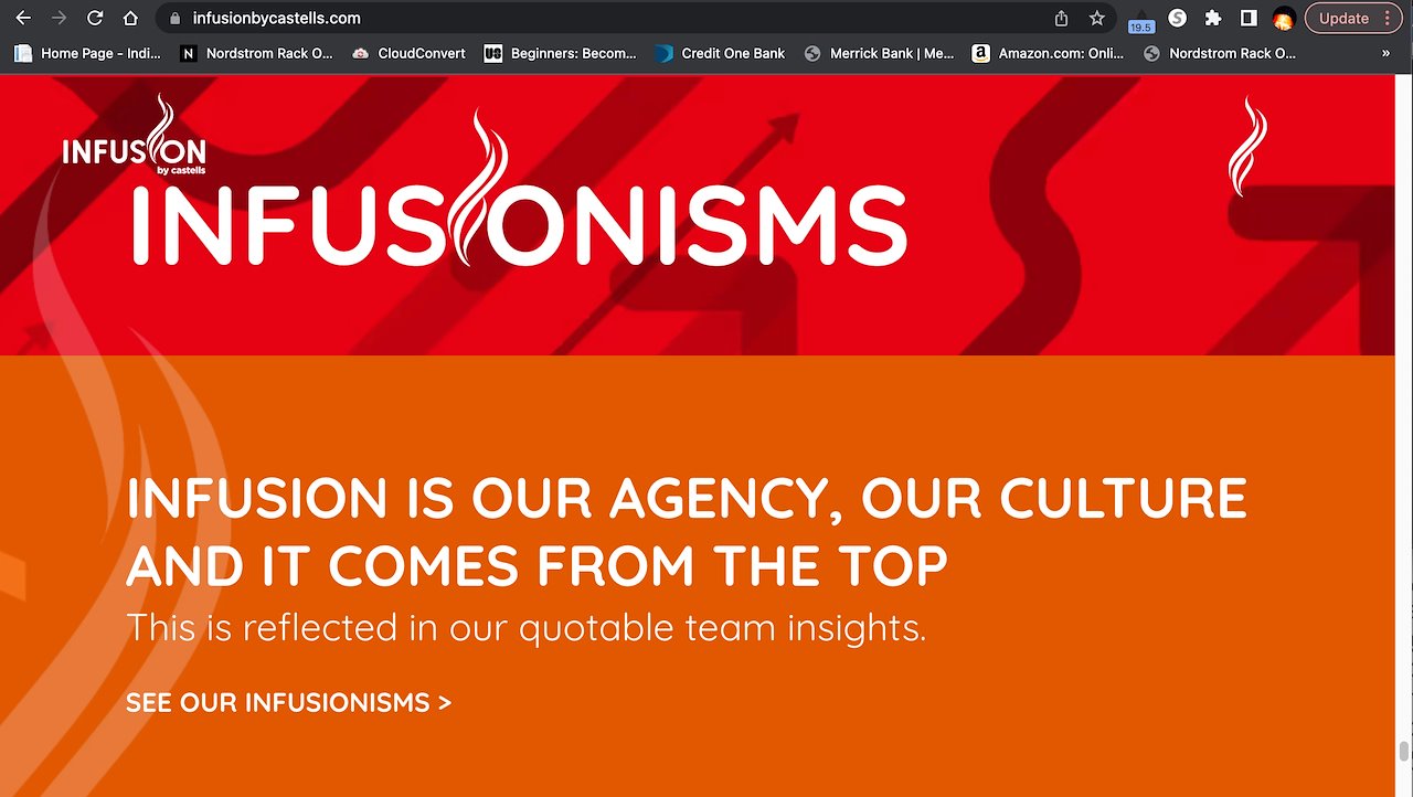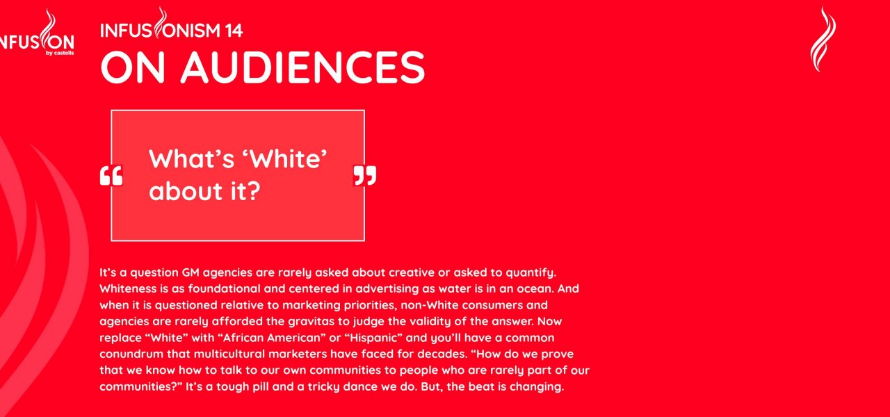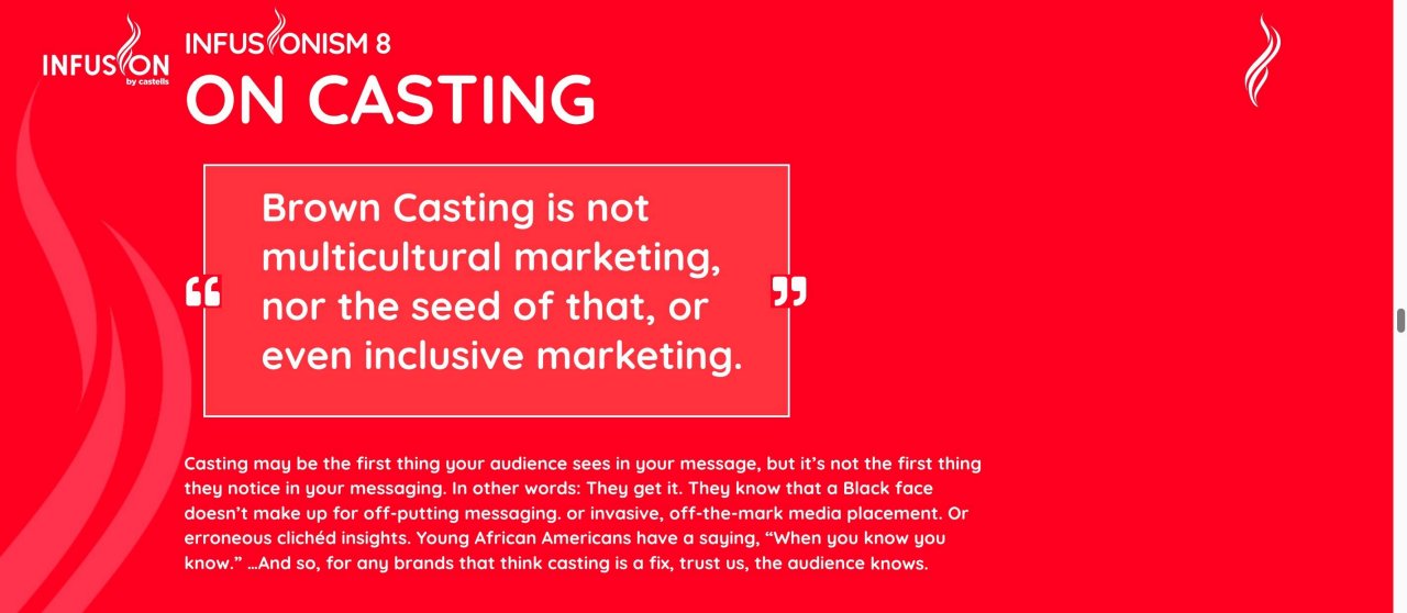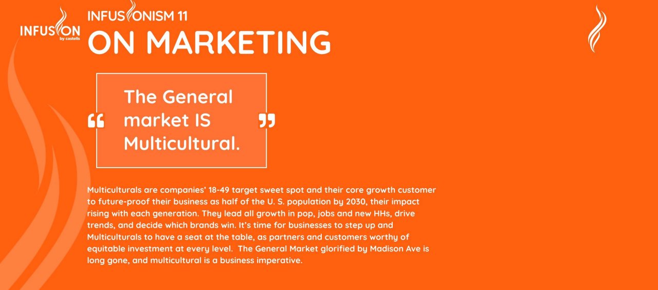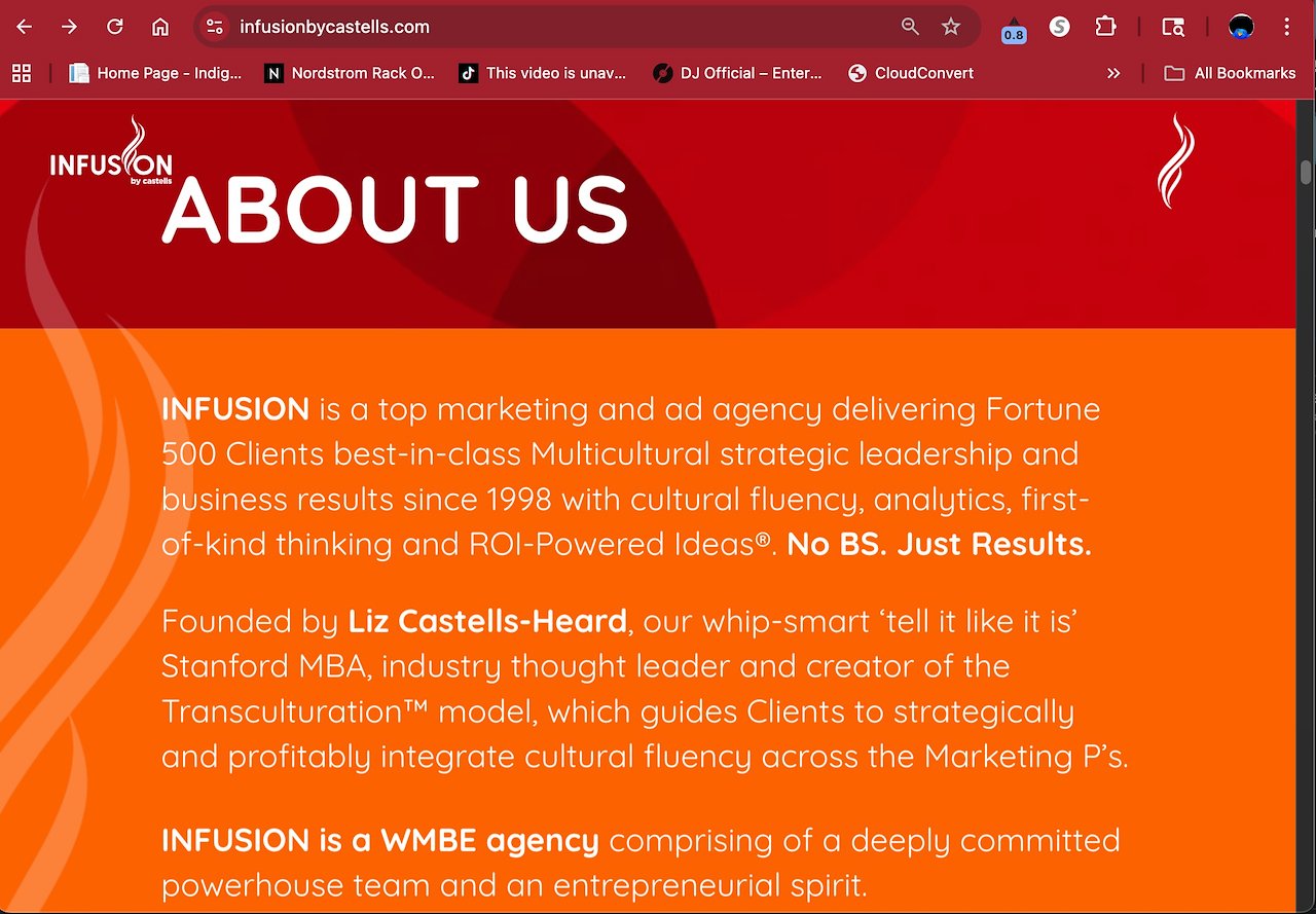 Castells was my home for 3.5 years. Launched in 1998, they needed a new voice; a soul. So, we began with a name-change: “INFUSION by Castells” (now. just INFUSION.) Next, a clearer mission: Become a truly multicultural shop, not just a Hispanic-centric vendor (as they were for 20 years).
