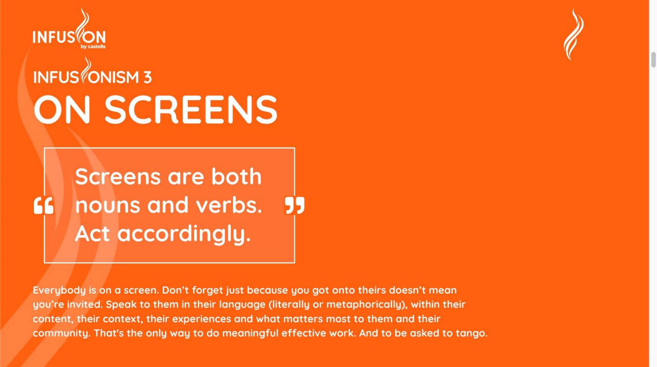 I articulated a unique vision crystalized thru smart inclusive philosophy. Expressed some “Infusionisms”— bite-sized, truisms and insights for clients and pros alike. I also scripted up a fresh website. a fresh agency showcase video that really shines.